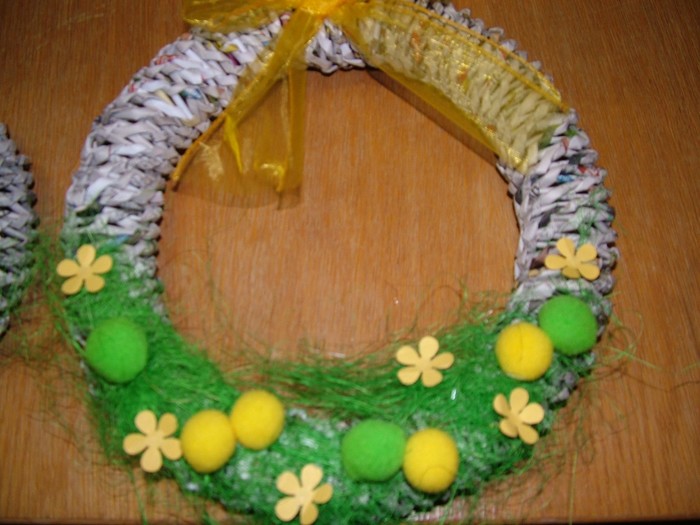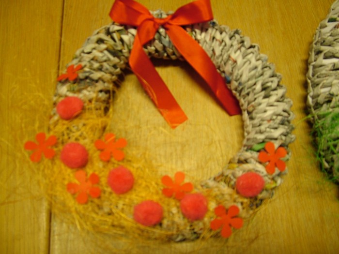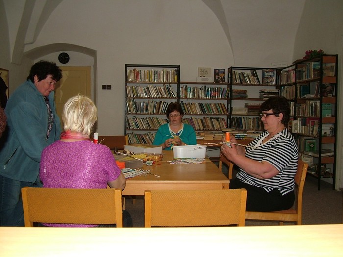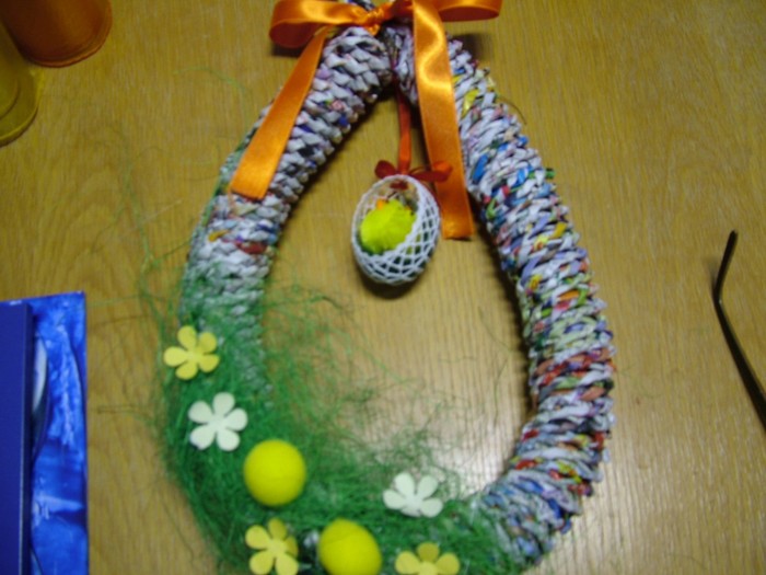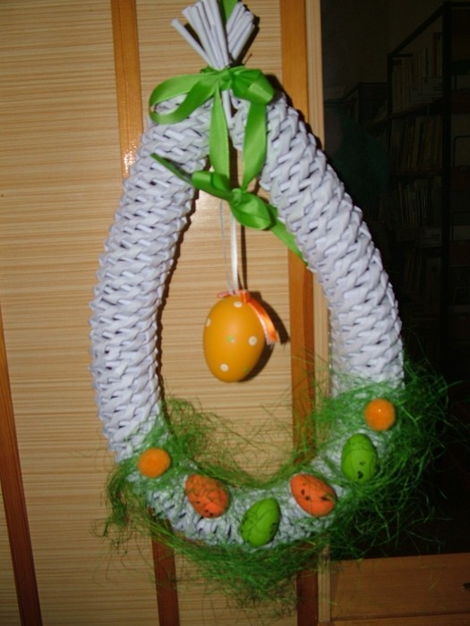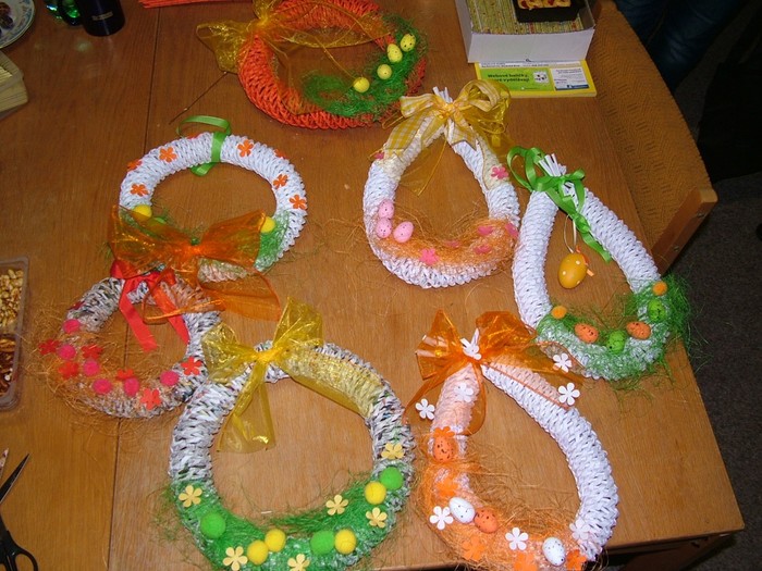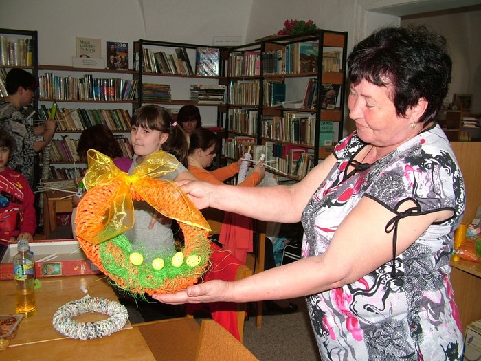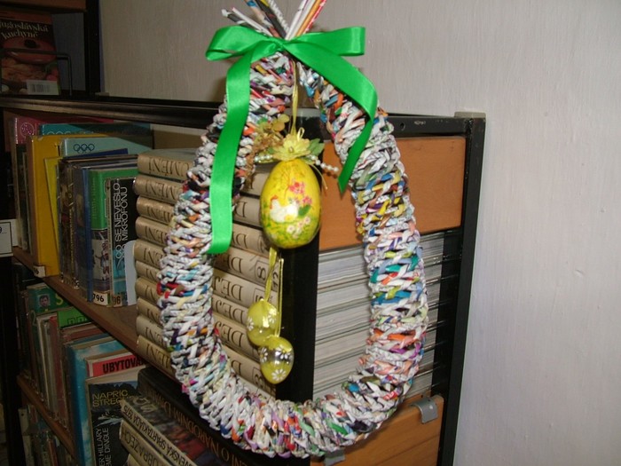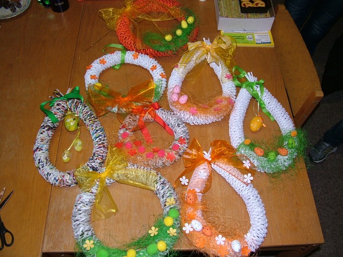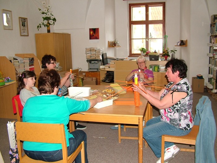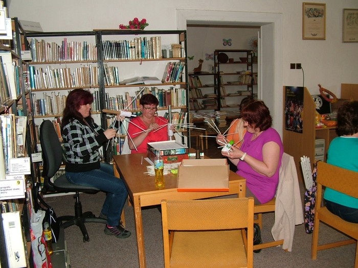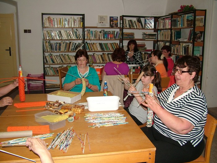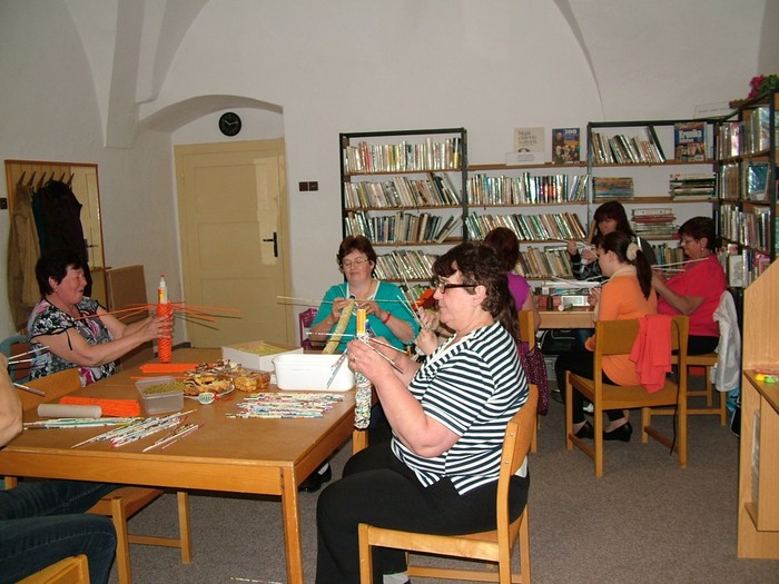 Ruce dvanácti šikovných pletařek vytvořily v úterý 8.4.2014 v Potštátské knihovně velikonoční věnce a vajíčka z papíru tentokrát technikou krouceného pletení.